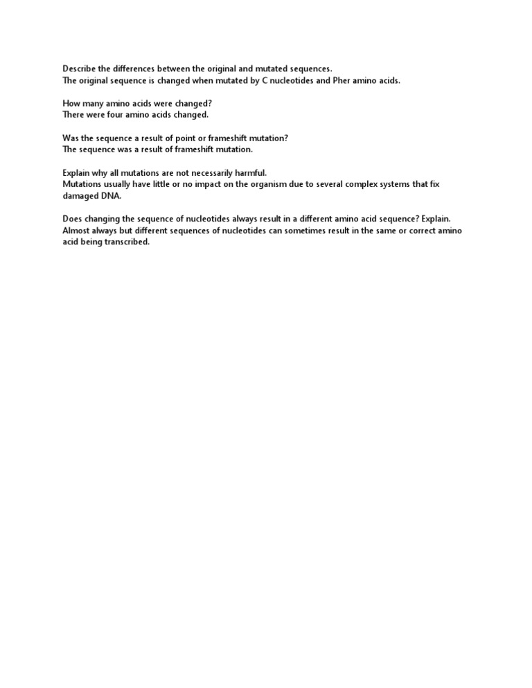 In each of the following dna sequences, you will use the mrna and amino acid sequences to identify the mutation that occurred and the effects of.